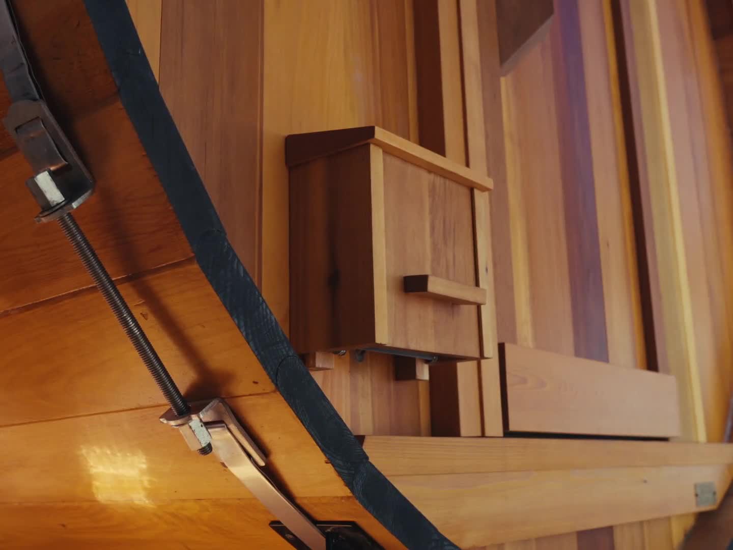 Lift the lid on the black heater box on the outside of the sauna.